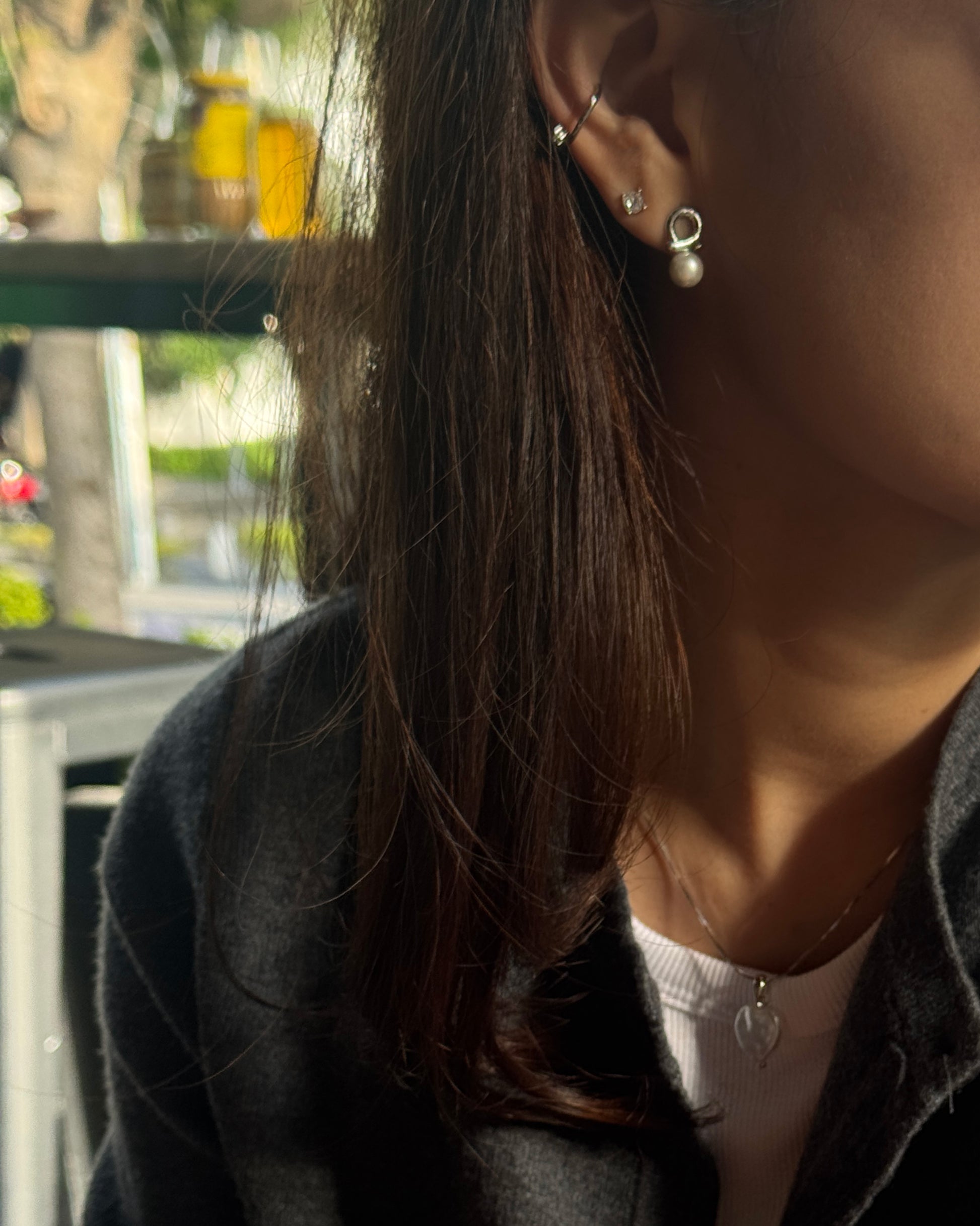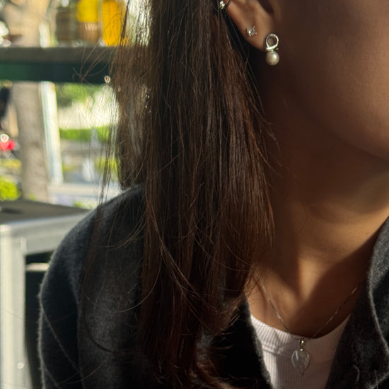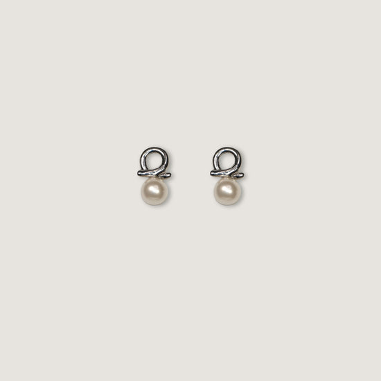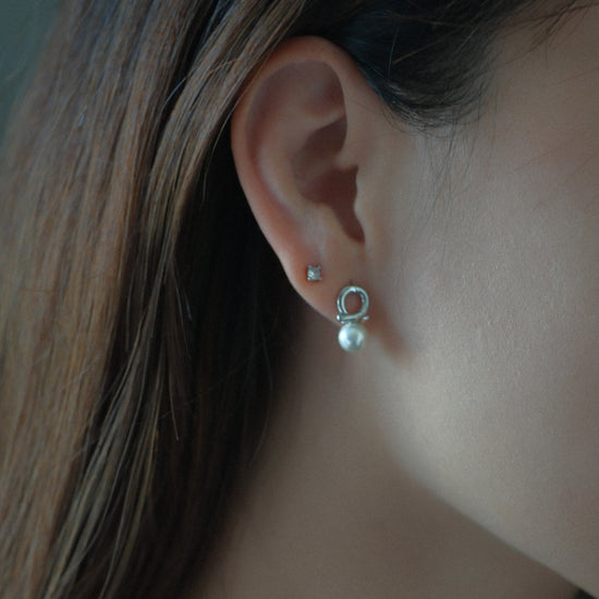 El arete combina curvas modernas en plata con una perla.