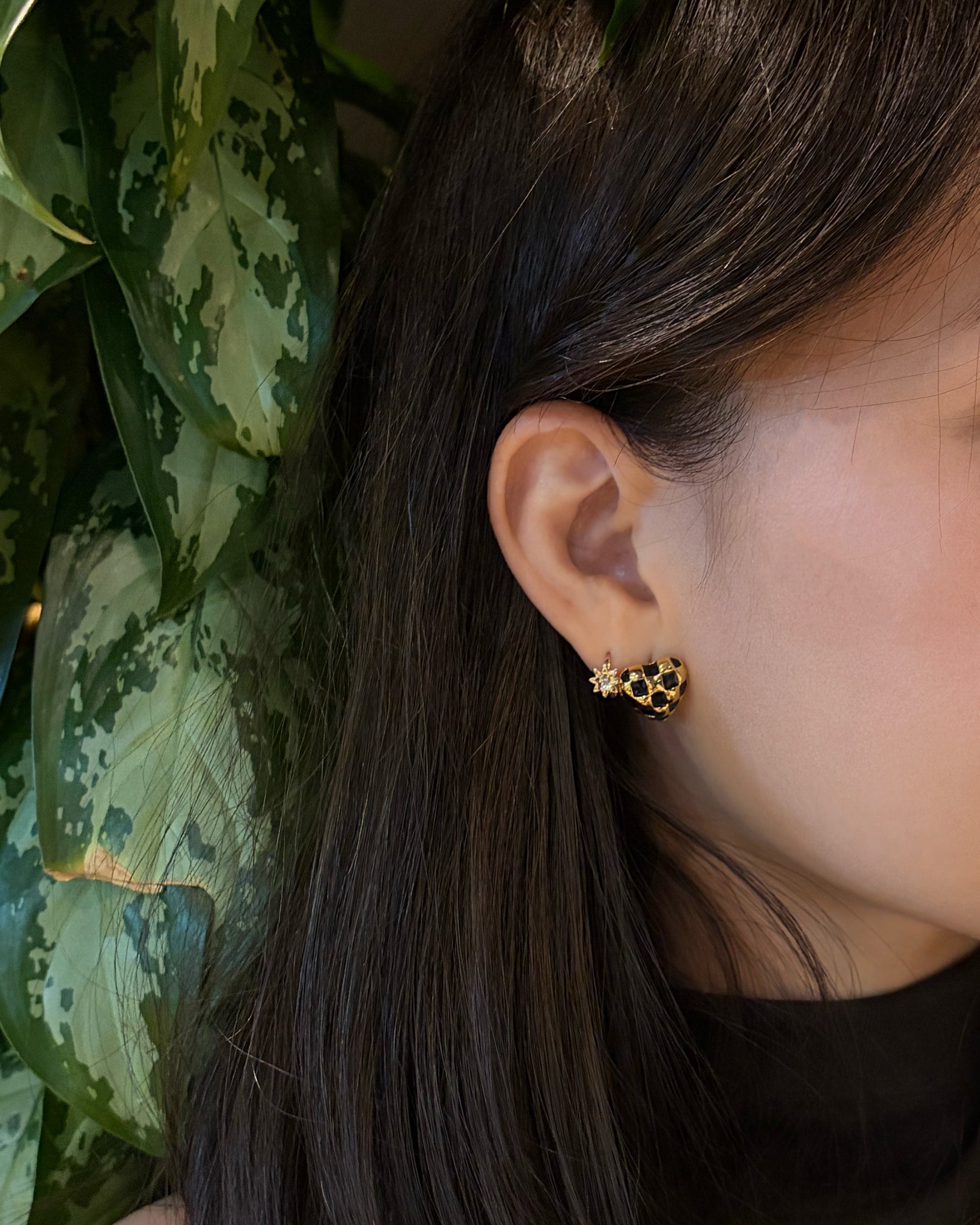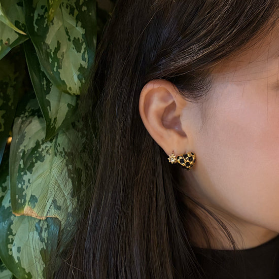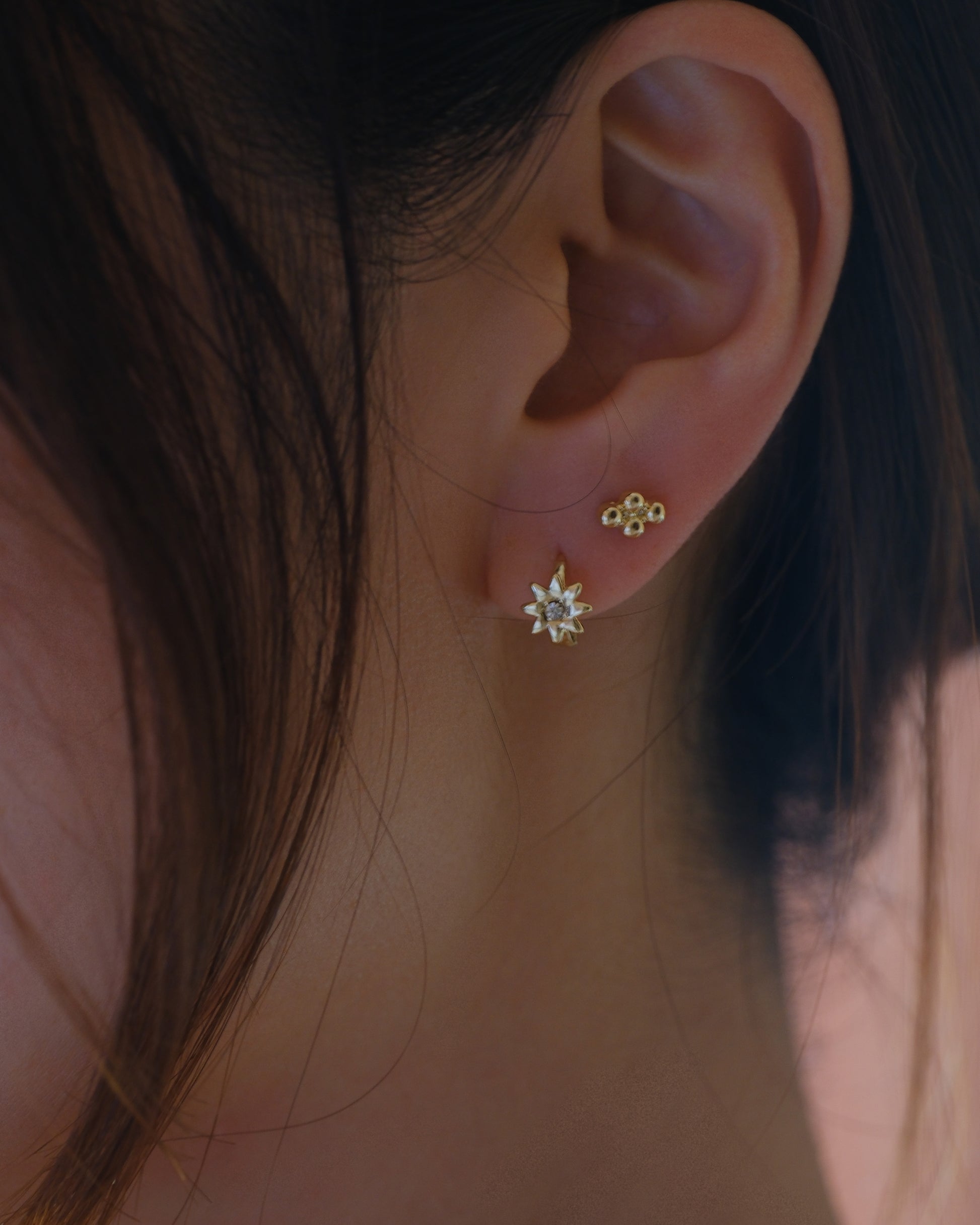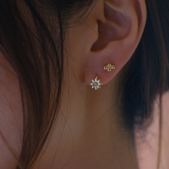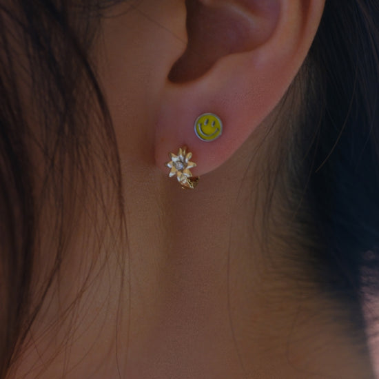 Mini argollas doradas con detalle floral y un cubic central que aporta un brillo delicado y elegante, perfectas para el día a día