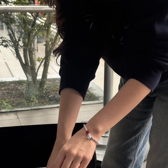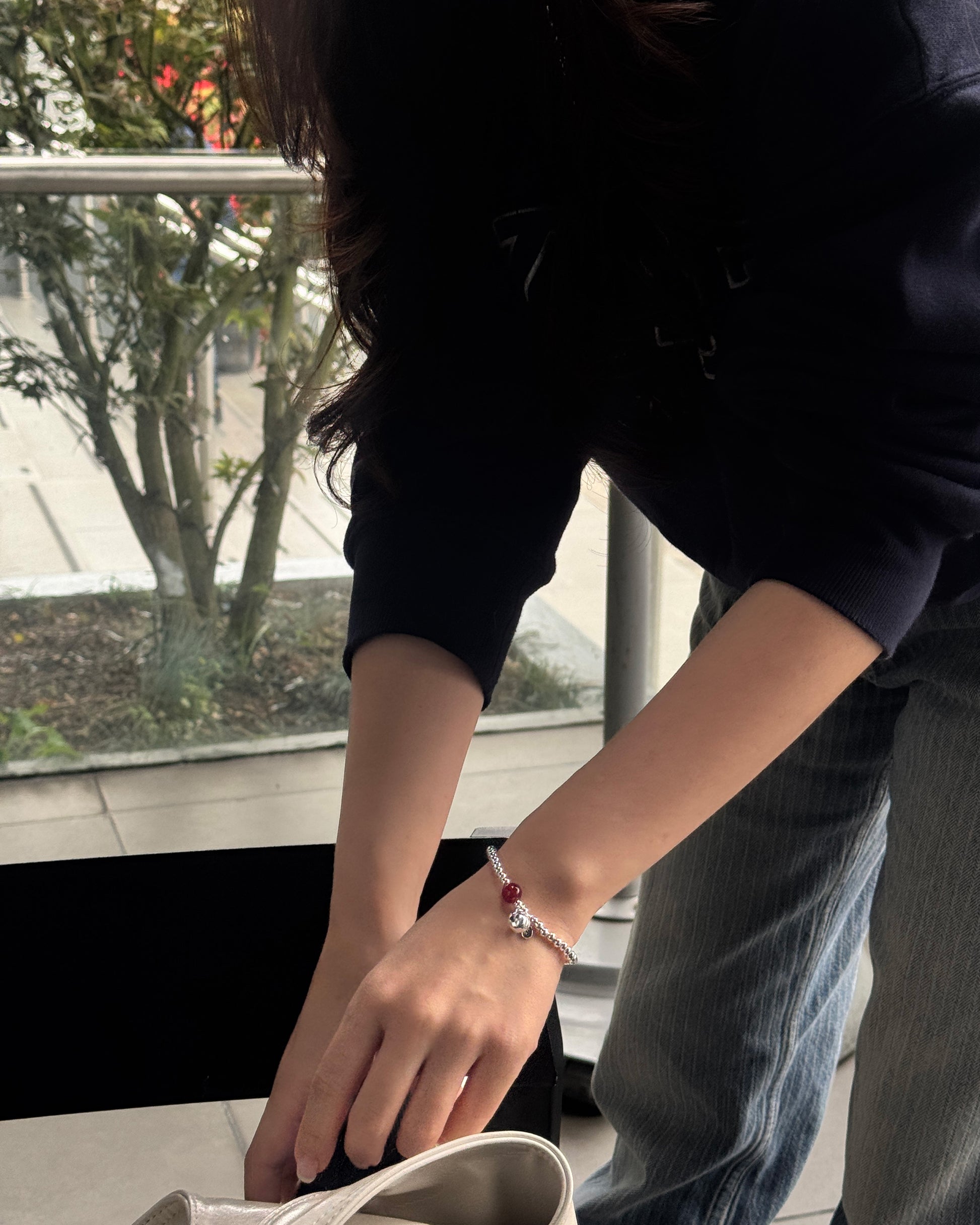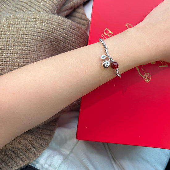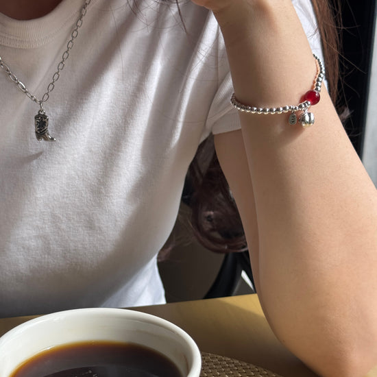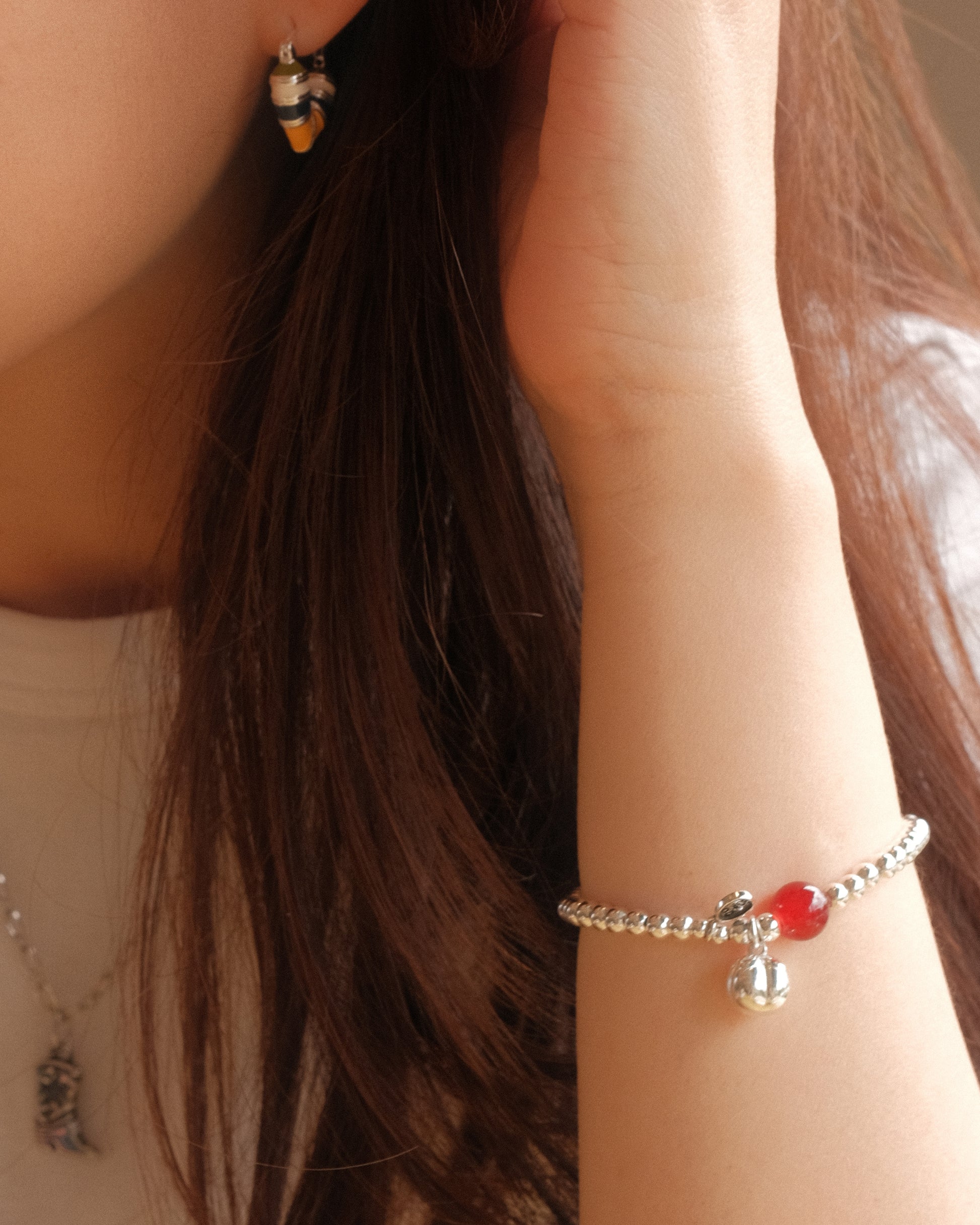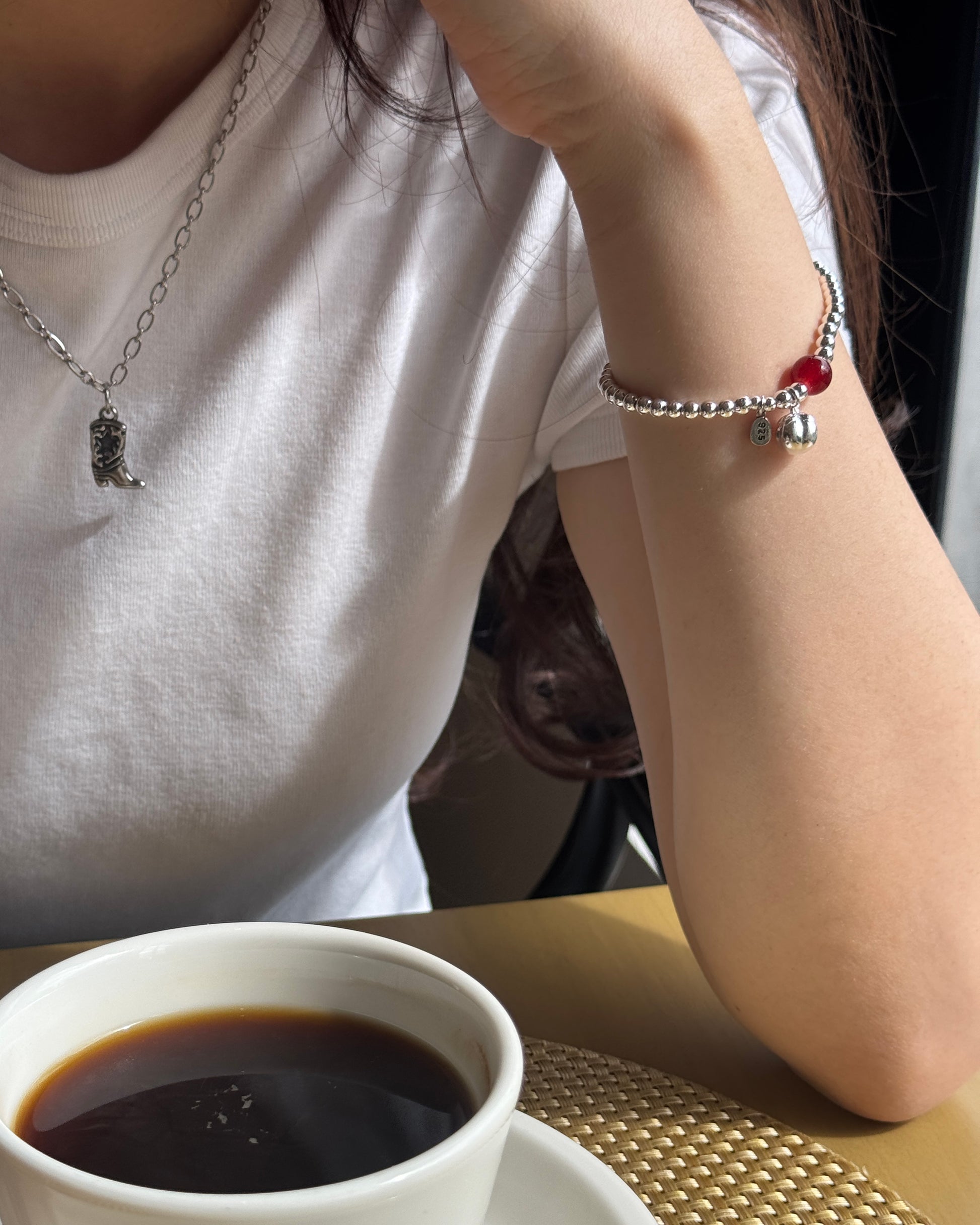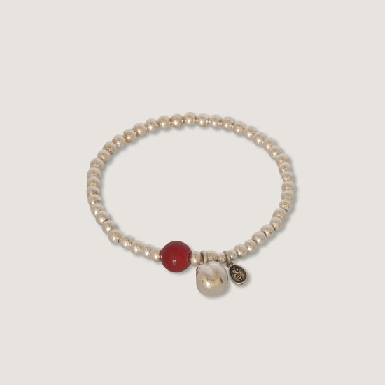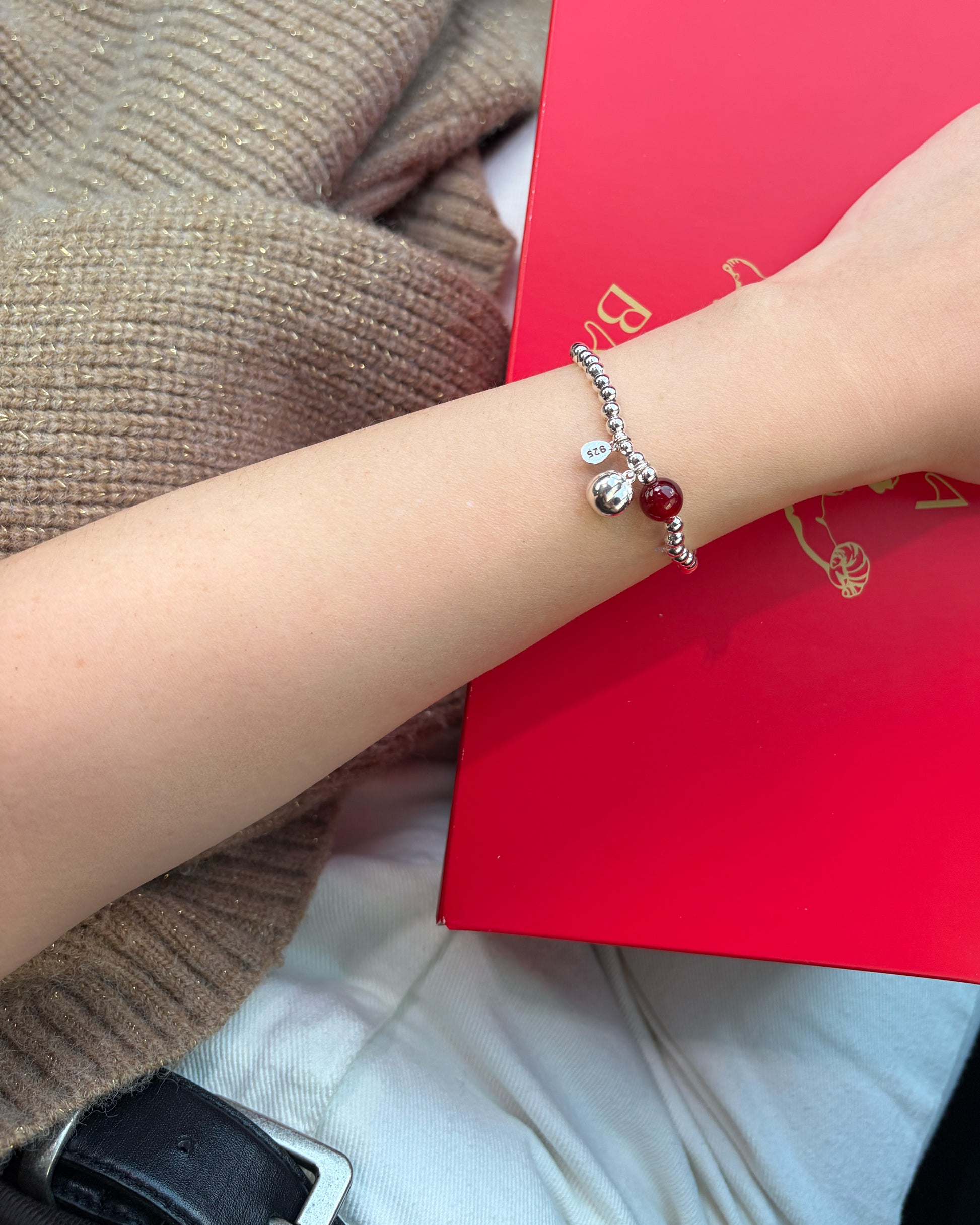 Pulsera elástica de esferas plateadas con un charm rojo circular que aporta un acento de color sutil y moderno.